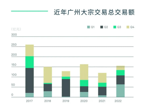 广州大宗交易市场成交金额有所攀升,2022年全年录得156亿元的交易,同比上涨18%。一方面,不良资产的投资机会有所增加,且由于开发商积极优化资产组合,加快资产处置,市场可售存量商用资产增多。另一方面,资产价格松动也利于交易的达成。年内写字楼和商业物业的资本值有所下降,但核心区资本值更为坚挺。