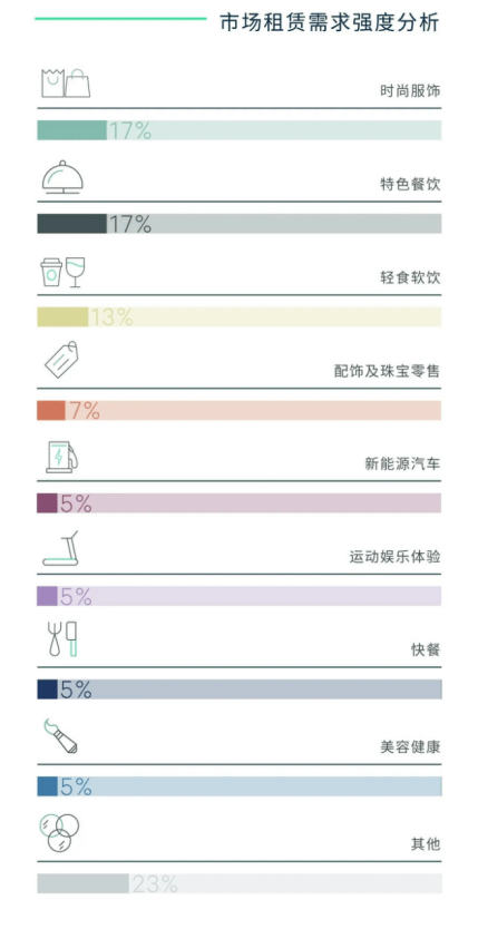 租户成交方面,时尚服饰、特色餐饮、轻食软饮、配饰及珠宝、新能源汽车和运动娱乐体验业态全年录得的新开店铺数量分别位列前六位,占全部成交的67%。其中,天河路在各商圈中录得最多国内外知名时尚服饰品牌的广州首店,包括三宅一生、巴黎世家、Marni Market和ARKET等。而特色餐饮方面,日料和火锅年内积极扩张,部分软饮品牌新开西式简餐副线,带给市场更多样化的就餐选择。而在新开业的轻食软饮中,国内外咖啡茶饮品牌拓店最为积极,如Manner、皮爷咖啡和.jpg;其次是各糕点面包品牌,如露丝卡文世界冠军面包、虎头局和面包新语等。新能源汽车表现同样突出,录得的成交占全部成交的5.6%,其中81%的新开门店位于非核心商圈。