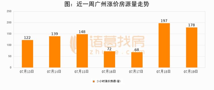根据诸葛找房数据显示,广州24小时涨价房源量为178套,较07月18日减少19套,环比下降9.6%。与此同时,涨价房源占比小幅回落,对于购房者来说是一个入市窗口期,购房者可抓住时机入市。