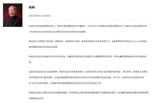 海航集团官网显示,陈峰毕业于德国汉莎航空运输管理学院,并获得荷兰马斯特里赫特管理学院工商管理硕士学位;曾获得美国哈佛大学商学院高级管理毕业证书。陈峰是海航集团创始人,现担任海航集团有限公司董事长,曾在中国民航局与国家空中交通管制局担任职务,同时也曾是海南省省长的航空事务助理。