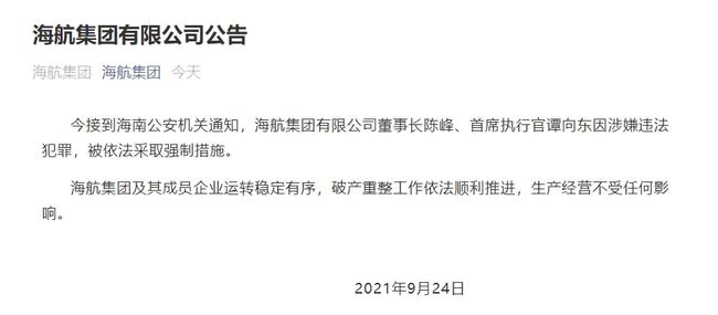 9月24日晚间,海航集团官方微信发布公告称,今接到海南公安机关通知,海航集团有限公司董事长陈峰、首席执行官谭向东因涉嫌违法犯罪,被依法采取强制措施。