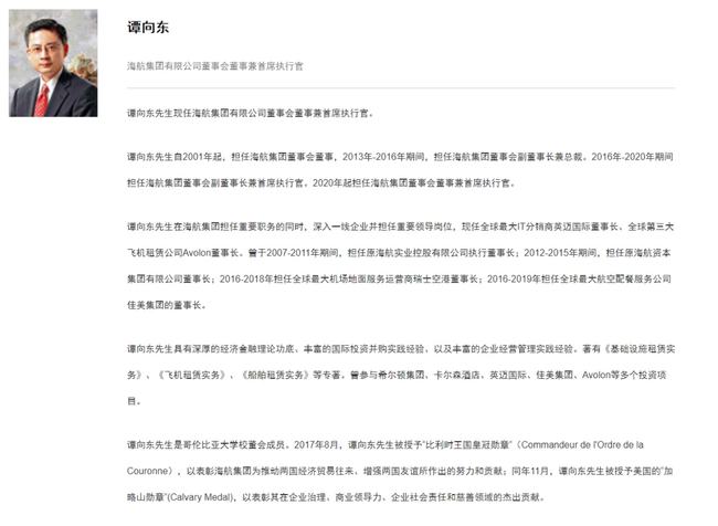谭向东自2001年起 担任海航集团董事会董事,2 013年-2016年期间担任海航集团董事会副董事长兼总裁; 2016年-2020年期间担任海航集团董事会副董事长兼首席执行官; 2020年起担任海航集团董事会董事兼首席执行官。