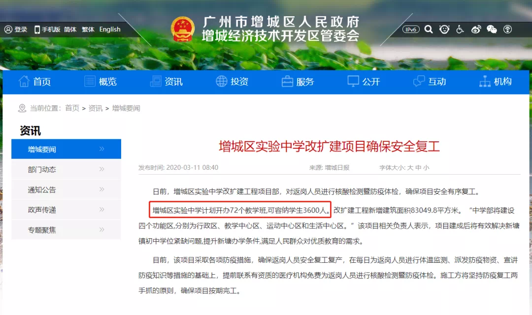首先,关于在增城区实验中学旁建设一所36班小学,政府回复中说到用地已经落实了,即将启动建设工作,我们也可看到,在增城区实验中学旁有许多的空地可以用于建设。