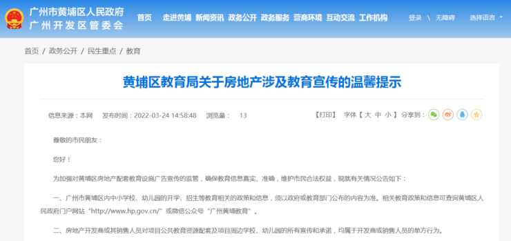 所以,今年3月广州市黄埔区教育局发布了《关于房地产涉及教育宣传的温馨提示》。