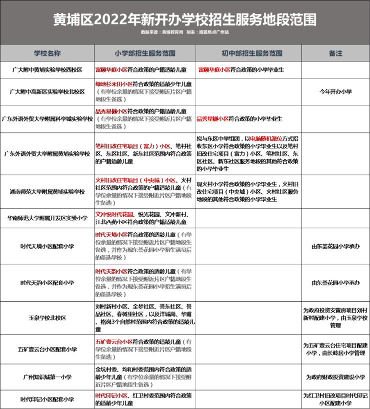 在本次公告中,黄埔教育局表示,在保持原有学校招生服务地段基本稳定的基础上,经报区政府批准,今年拟新开办学校招生服务范围有: