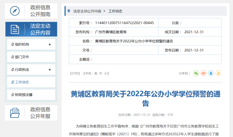 另值得关注的是,早在去年年底,黄埔区教育局就发布了《关于2022年公办小学学位预警的通告》,其中8个街道、11所小学学位紧张。