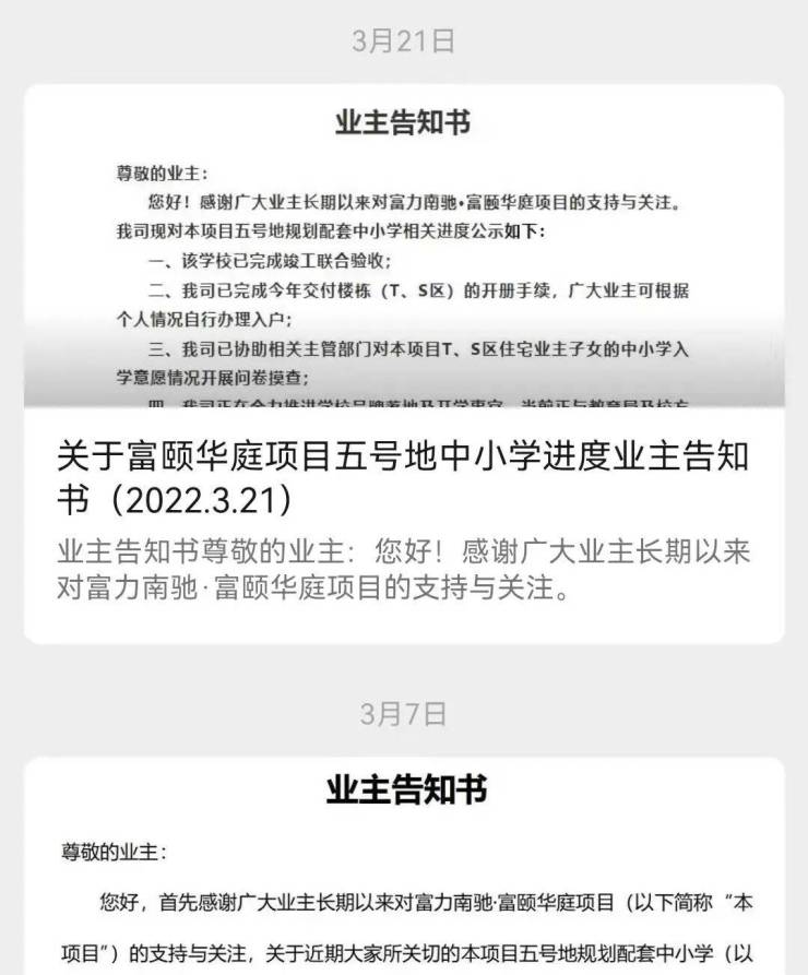 其中,曾因“学校不确定”的富力南驰·富颐华庭,引发了部分业主到项目现场维权,此后该项目还两次发布业主告知书。