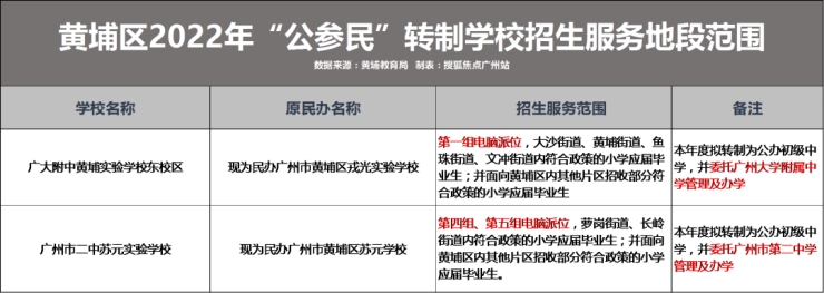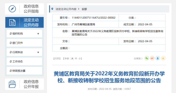 黄埔区教育局发布了2022年义务教育阶段新开办学校、新接收转制学校招生服务地段范围的公告。