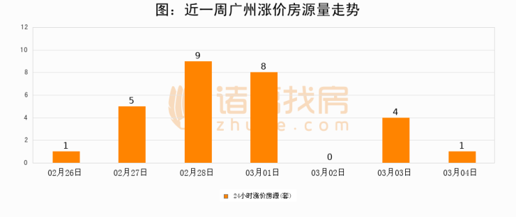 根据诸葛找房数据显示,广州24小时涨价房源量为1套,较03月03日减少3套,环比下降75%。与此同时,涨价房源占比小幅回落,对于购房者来说是一个入市窗口期,购房者可抓住时机入市。
