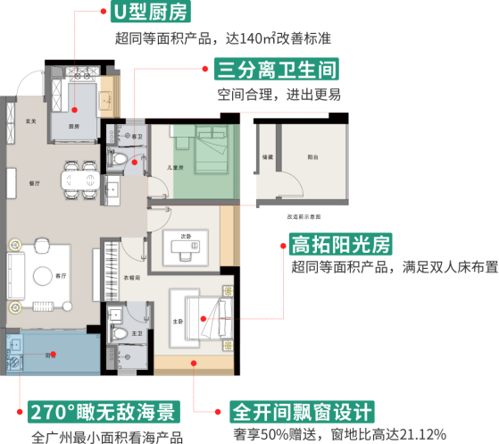 建面约89㎡三房两厅两卫,以小面积大户型的产品力冠誉全南沙!作为全广州最小面积的看海产品,东北户真正实现270度无敌看海;U型厨房设计,科学布局,在此烹饪全家幸福滋味;全开间飘窗设计,将赠送率拉满;同时客餐厅一体化设计,小空间容纳大梦想,尤其值得一提的是,阳台开间去到3.6米,进深1.6米,真正实现了在家就能看海、看山、看园林的梦想!