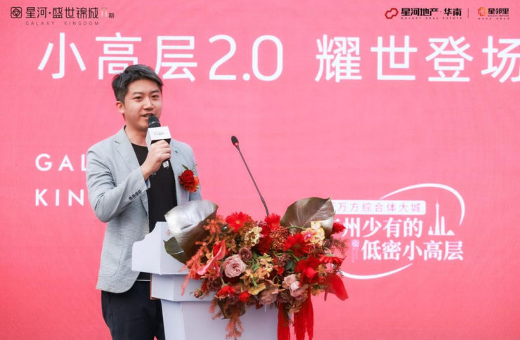 伴随热烈的掌声,星河·盛世锦城项目营销总经理张虹玉先生首先上台发表致辞,感谢每一位到场合作伙伴、媒体朋友以及嘉宾们,一同见证此次小高层2.0的新品发布会。星河作为城市运营引领者,一直致力于参与城市的发展建设,为城市带来进阶的人居作品。