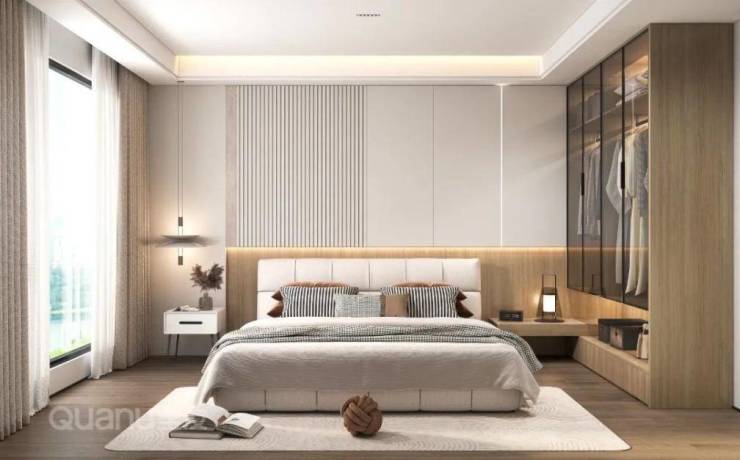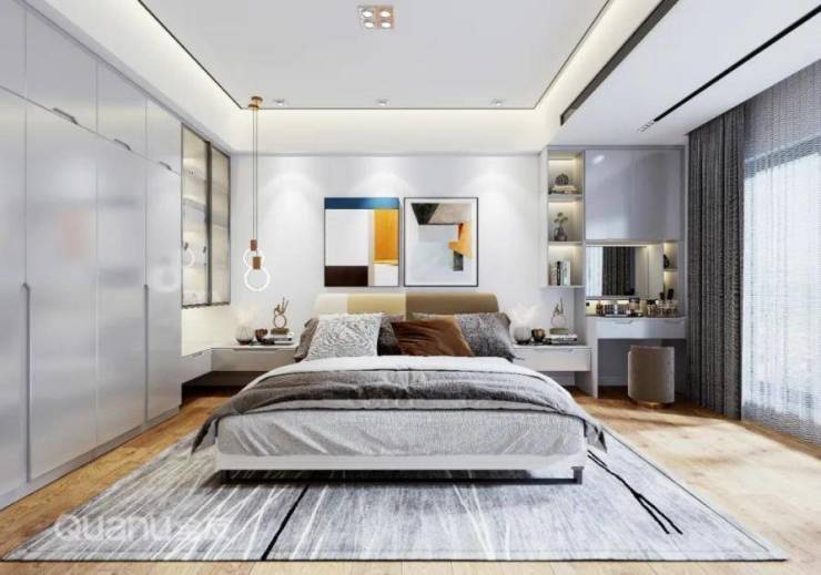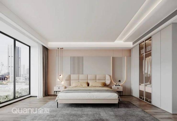 为了节约空间,设计师还会将衣柜和床头柜做一体设计,直接连接衣柜做悬空台面,睡前随手就能置放手机、眼镜等物品,视觉上更轻盈通透,也避免了卫生盲区,扫地机器人可以轻松出入。
