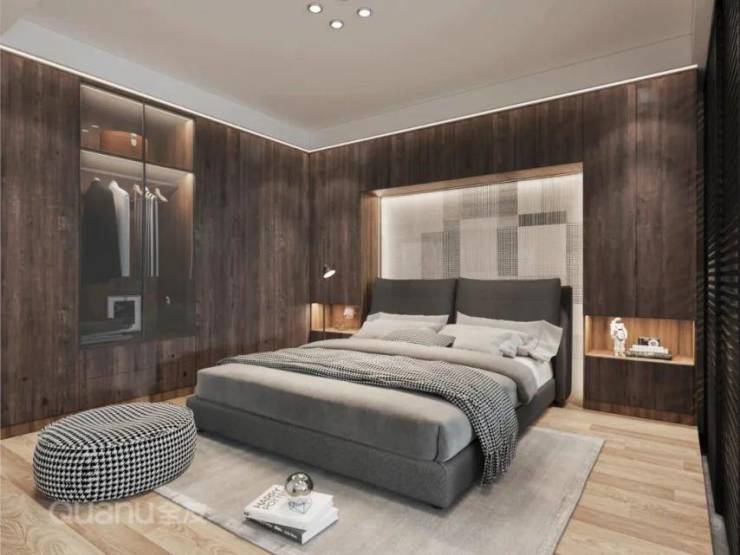 衣柜+电视柜这种设计多适用于进深比较宽的卧室,一般是在床尾定制“回字形”柜体,然后预留出电视的位置,不仅满足了日常的追剧需求,柜体还能充当背景墙做装饰。