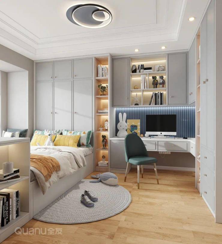 衣柜搭配榻榻米的设计常见于小面积的多功能房或儿童房,榻榻米就可以用来收纳被褥、反季衣物等不常用的物品。通常,设计师还会搭配书桌柜,提升小空间的利用率,休息、储物、学习办公一举多得。