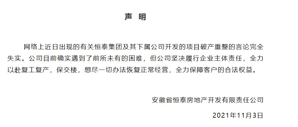 11月3日,安徽省恒泰房地产开发有限责任公司官方微信公众号“恒泰地产”发布声明称,网络上近日出现的有关恒泰集团及其下属公司开发的项目破产重整的言论完全失实。公司目前确实遇到了少有的困难,但公司坚决履行企业主体责任,全力以赴复工复产,保交楼,想尽一切办法恢复正常经营,全力保障客户的合法权益。