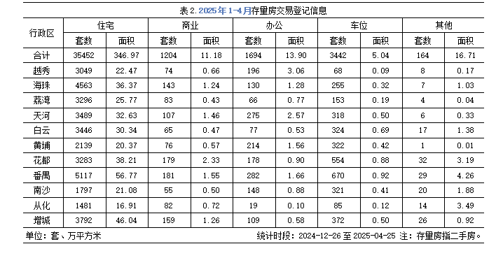 在交易登记方面,从广州住建局官网数据可见,今年前4月(统计时段:2024年12月26日至2025年4月25日),广州二手住宅已交易登记35452套,登记面积346.97万平方米,同比去年同期的28498套,277.32万平方米分别大增24.4%、25.1%。今年前4月二手住宅交易登记套均面积97.9平方米,比去年同期的套均面积97.3平方米微增,显示当下置业主流或仍以刚需和改善为主。