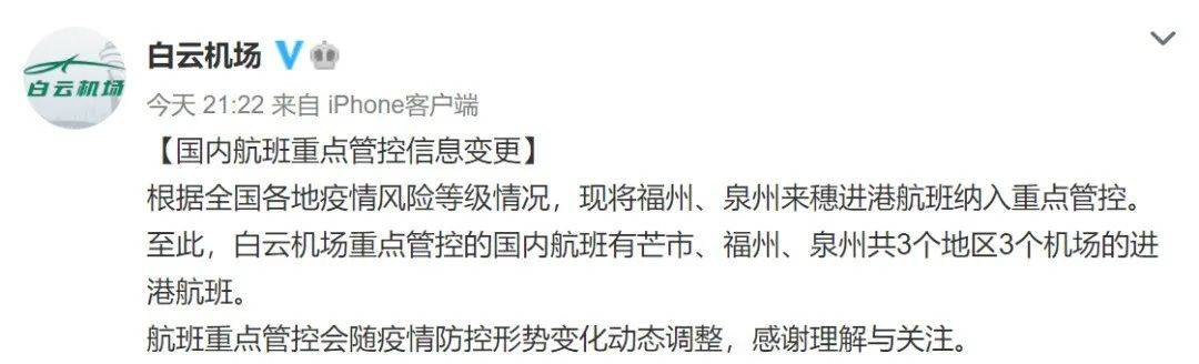 9月11日晚,广州白云国际机场发布通告称:根据全国各地疫情风险等级情况,现将福州、泉州来穗进港航班纳入重点管控。至此,白云机场重点管控的国内航班有芒市、福州、泉州共3个地区3个机场的进港航班。