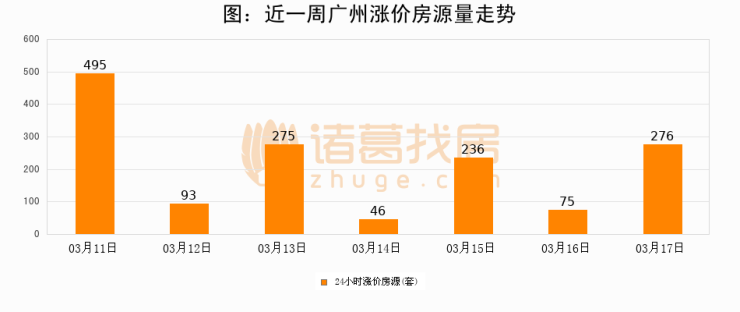根据诸葛找房数据显示,广州24小时涨价房源量为276套,较03月16日增加201套,环比上涨268%。与此同时,涨价房源占比小幅扩大,业主信心有所提升。