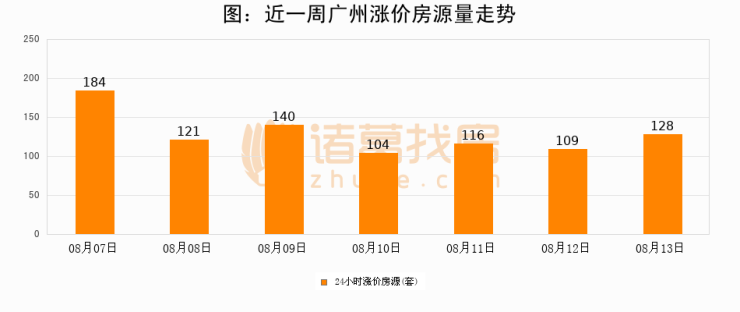 根据诸葛找房数据显示,广州24小时涨价房源量为128套,较08月12日增加19套,环比上涨17.4%。与此同时,涨价房源占比小幅扩大,业主信心有所提升。