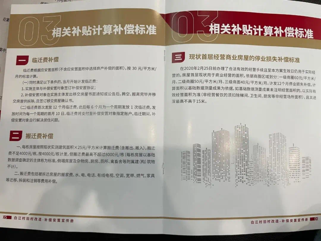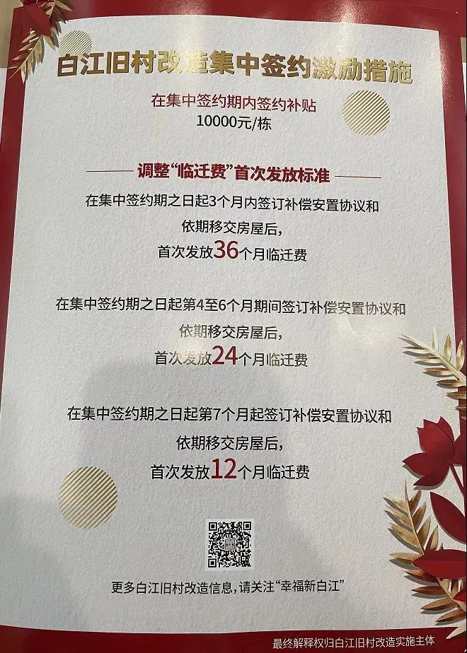 为了鼓励村民在集中签约阶段签约,此次白江村改造补偿安置方案将签约激励措施主要放在按栋以及调整“临迁费”首次发放标准上:具体情况如下:在集中签约期内签约补贴10000元/栋。对于临迁费的发放,集中签约之日起3个月内签订安置协议和依期移交房屋后,依次发放36个月临迁费;4至6个月完成,首次发放24个月临迁费;7个月起完成,发放12个月临迁费。