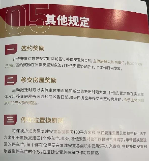 弃产补偿面积不得超过其名下复建安置总面积的 30%,应安置面积弃产补偿标准弃产补偿标准为 8500 元/平方米。签约移交每栋各奖励2万安置面积满100平,须置换停车位除了赔偿,旧改离不开各式各样的奖励。在签约奖励上,白江村在规定时间前签订补偿安置协议,奖励20000元/栋。(15个工作日内发放)移交房屋上,在发出移交房屋通告书面通知或公告日起30天内腾空并移交房屋,给予20000元/栋。