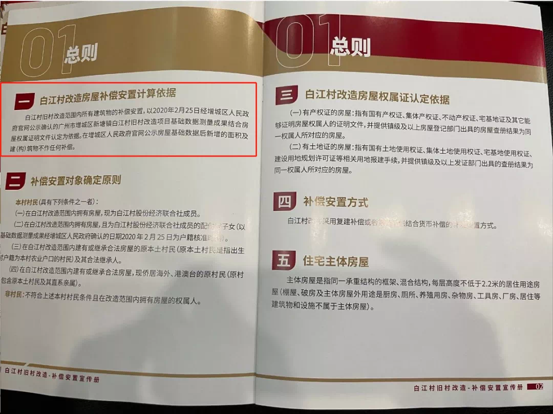 据宣传册所示,白江村旧村改造范围内所有建筑物的补偿安置,以2020年2月25日经政府官网公示确认的基础数据测量成果,结合房屋权属证明文件认定为依据。(最终实际改造范围,最终以政府审批为准。)