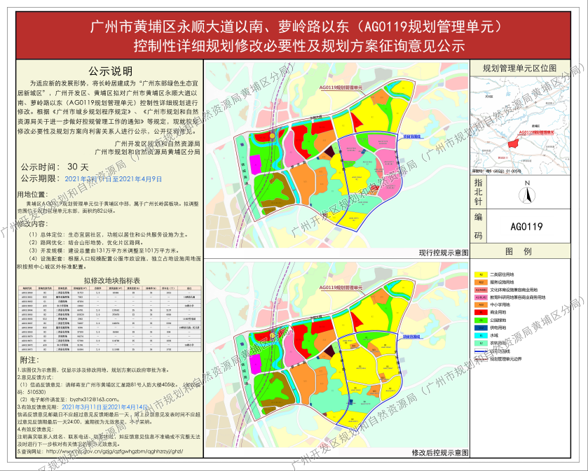 3月11日,黄埔区规资局就永顺大道以南、萝岭路以东地块控规调整方案征询意见进行公示。