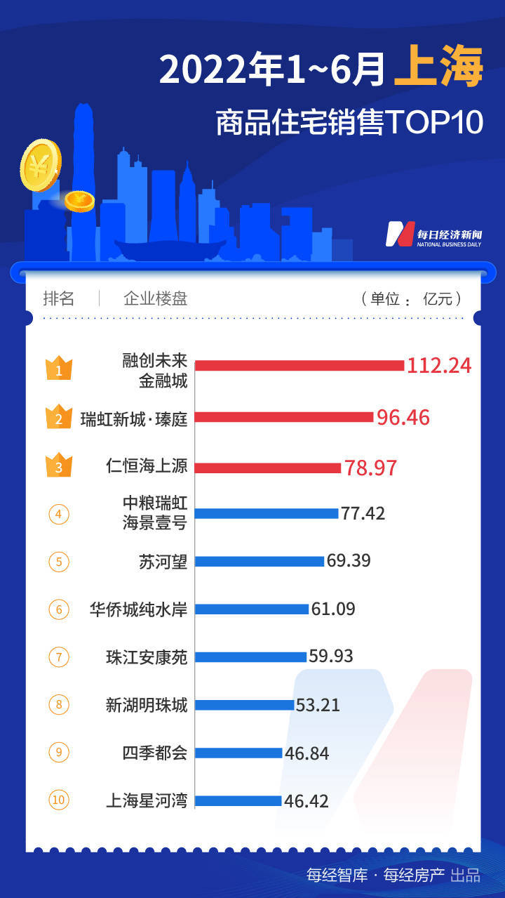 上海成为单月销售最热城市,TOP10项目在6月份卖出了近200亿元,其中新开盘的“瑞虹新城·瑧庭”售出96.46亿元,“仁恒海上源”超48亿元,“珠江安康苑”开盘销售近60亿元。