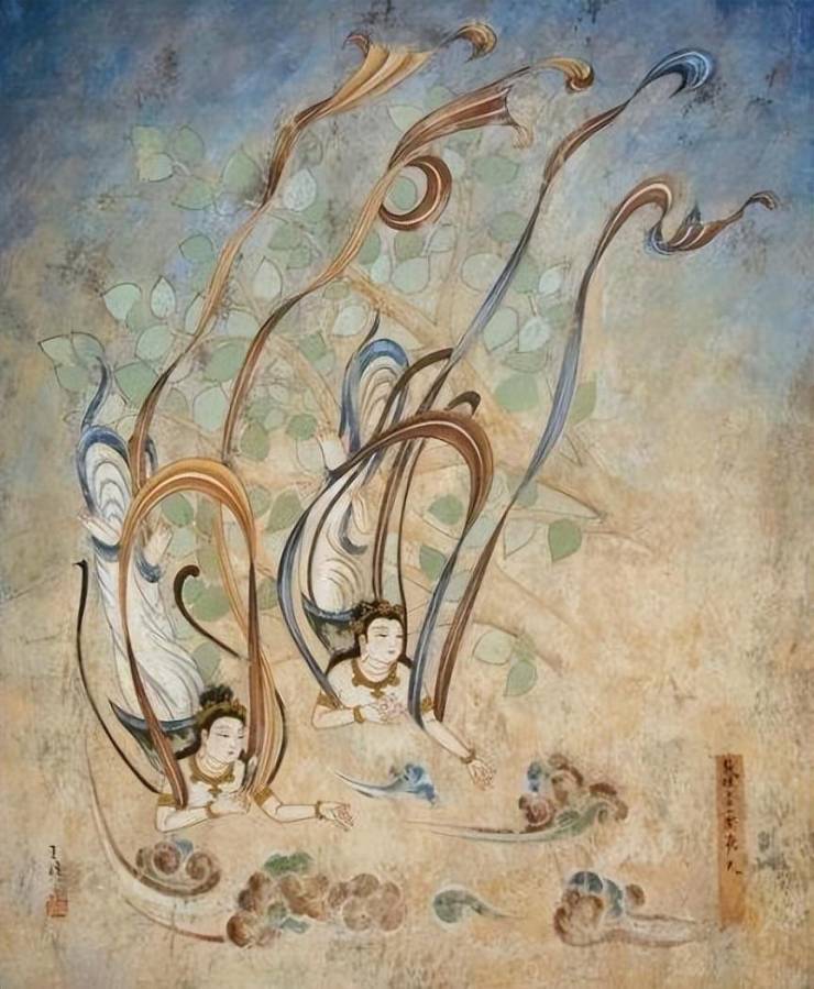霞光掠过茫茫大漠,耳畔传来重重叠叠的驼铃声响,又见飞天,丹彤碧绿映 在眼底,我们与它相遇。飞天艺术是盛开在大漠深处的曼珠沙华,那色彩与线条 仿佛流动的乐章,带我们穿越时间的砂砾,靠近那悠远的遐梦。而今,壁画上思 维定禅的瞬间化身为丝丝灵感,飞天的轻盈飘逸化身为灵动曲线,跨越久远的历 史长河 ,又在设计师曾静华的手中迸发出了新的活力 ,重现了昔日的时光。