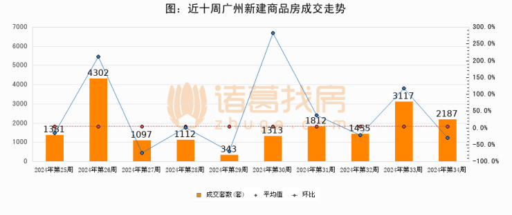 进入2024年第34周(08月19日-08月25日),广州新建商品房成交2187套,较上周减少930套,环比下降29.8%