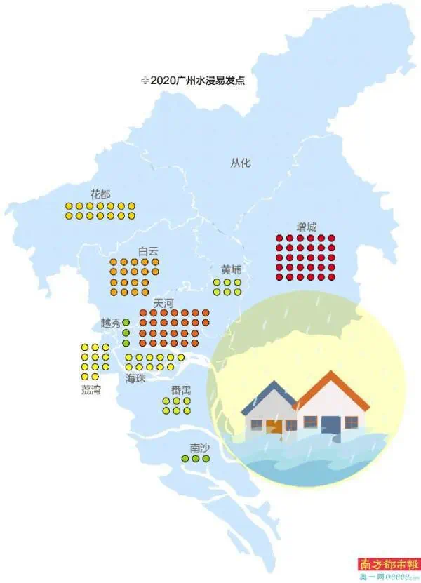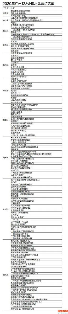 按行政区划分,增城区一共有30处地点被纳入,成为全市最多积水风险点的行政区;天河区以26处位居次席,白云区有18处,花都区有14处,海珠区和荔湾区各有11处,番禺区和黄埔区各有6处,南沙区和越秀区各有3处,从化区成为广州所有行政区中少有没有“上榜”积水风险点的区。