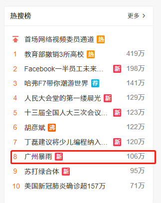 而“广州暴雨”在今天早上也成功登上了“微博热搜”话题。