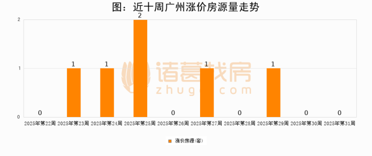 从调价房源来看,第31周广州涨价房源0套,较上周持平。与此同时,31周涨价房源占比持平