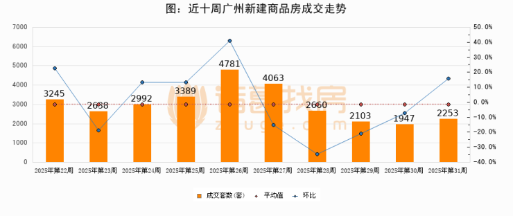 进入2025年第31周(07月28日-08月03日),广州新建商品房成交2253套,较上周增加306套,环比上涨15.7%