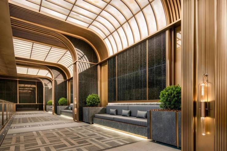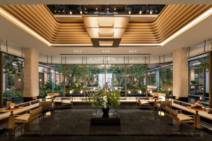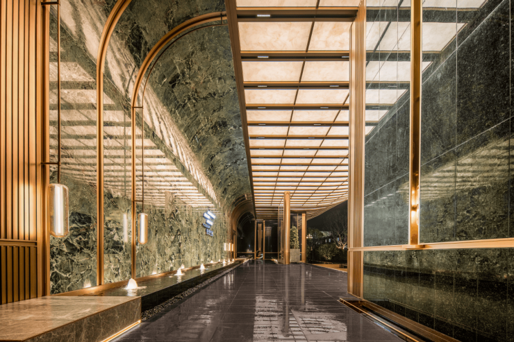空间以开放通透的格局迎宾,黑木纹大理石、古铜材质、艺术玻璃结合,光影交错之间,共同勾勒出“门厅如院”的东方审美。