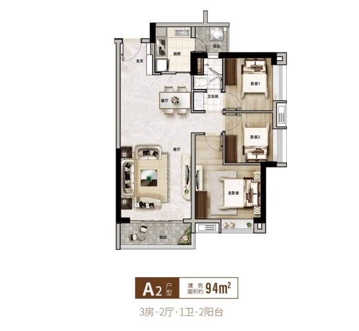 以建面约94㎡三房两厅户型为例,餐客厅一体化,通透明亮空间感十足;双阳台设计,一面生活一面观景,兼顾实用与诗意同时互不干扰;卧室带大飘窗,空间更开阔舒适;南北通透,清风入户、光影随行,采光与通风性得到保障。主卧套房设计,生活从容有序,日后跟长辈同住也能轻松愉悦。