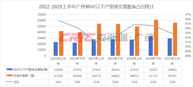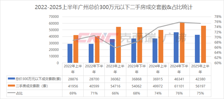 克而瑞数据监测显示,2025上半年广州二手房成交56197套,其中总价300万元以下二手房成交43280套,占比达到了75%。