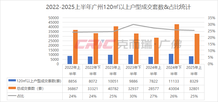 相反,120㎡以上改善户型商品住宅成交8329套,占比25%,较去年同时期减少2%,且从半年度走势看,占比在逐一减少。