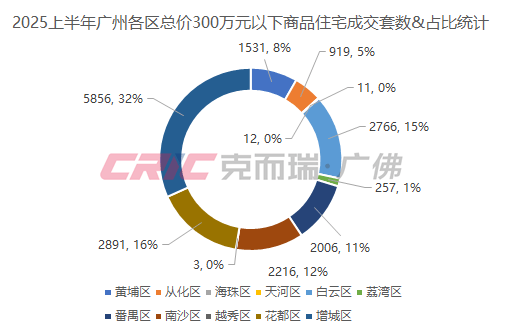 扩大范围看全市整体情况,克而瑞数据监测显示,2025上半年增城、花都、白云成为了总价300万元以下刚需的购房者的主力成交区域,三者成交占比达到了62%。