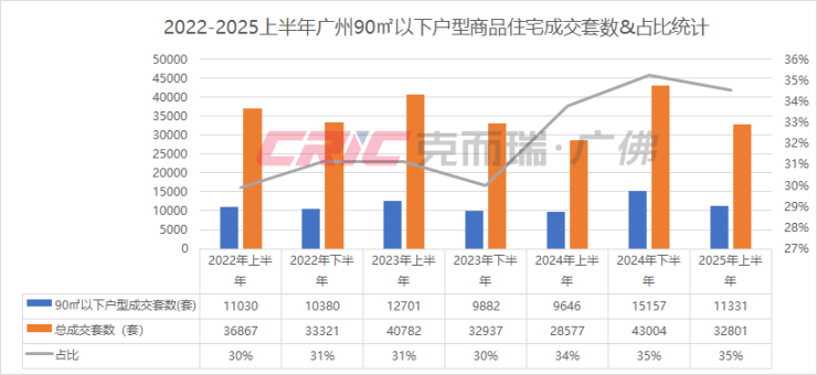 克而瑞数据监测显示,克而瑞数据监测显示,今年上半年广州90㎡以下户型供应64.67万㎡,较去年同时期增长12%,成交93.32万㎡,同比增长18%。