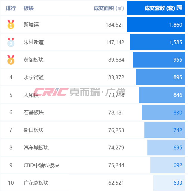 朱村街道以1585套成交规模分别位列第二位,黄阁板块以955套成交套数位列第三。