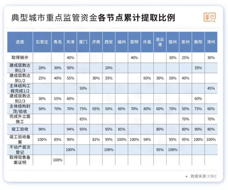 实际上,“按照工程进度分期付款”在各地的预售制度实践中已经明确,比如石家庄、青岛、天津、厦门、西安都有对于预售资金提取节点的规定。以石家庄为例,在建成层数达到三分之一时,开发商可提取预售资金的20%,主体结构封顶时可提取50%,直至竣工验收备案可提取100%。