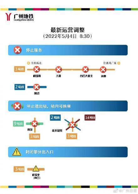 广州地铁通报,接政府部门通知,因疫情防控需要,自5月4日8:30起,三号线永泰站停止对外服务,二、三及十四号线嘉禾望岗站停止进出站服务,仅保留站内换乘功能。 截至目前,广州地铁共7个站点停止对外服务,包括二号线黄边站,三号线永泰站、白云大道北站、人和站、机场南站,三号线及九号线高增站、二、三及十四号线嘉禾望岗站,其中,嘉禾望岗站、高增站仅保留站内换乘功能。1个站点关闭部分出入口,三号线机场北站B口。