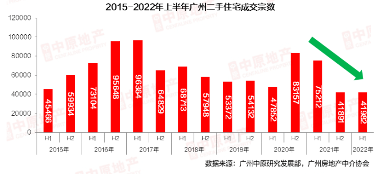 上半年,广州二手住宅共成交42002宗(中介网签+自助网签),对比去年同期,大幅下降了44.2%。