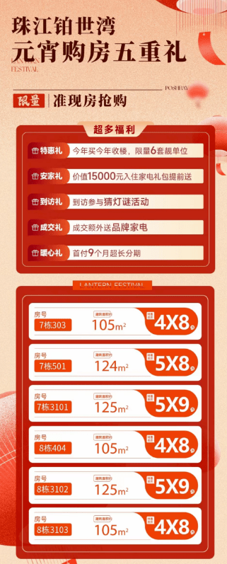 番禺的珠江铂世湾推出购房五重礼、其中包括6套一口价单位、价值15000元的家电礼包、成交送品牌家电等。