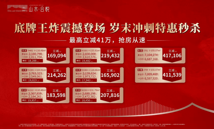 增城的山水合悦则是推出8套特价房,其中最高立减41万,该房源是建面约155平别墅产品,原价约700万,一口价659万多,立减411539元!