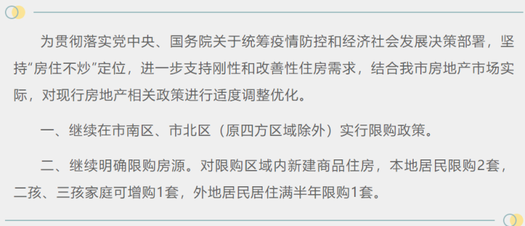 同日,山东青岛通过青岛市住建局官方微信公众号宣布调整限购政策,缩小限购范围,同时二手住房不再限购。但仅隔了一天,该公号已将“二手房不再限购”的相关内容删除。对此,青岛市住建局工作人员向媒体表示,确实“二手房不再限购”政策有所变化,市南区、市北区二手房仍实行限购政策,其他区域二手房放开限购。