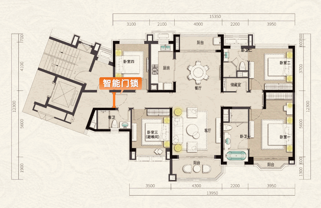 191㎡产品餐厅里配备楼宇可视对讲机,有人到访要经过视频才能进入,通过视频家中成员便能分辨是否可以开门;而客厅、卧室配置紧急按钮,排名前列时间关联家庭成员健康。