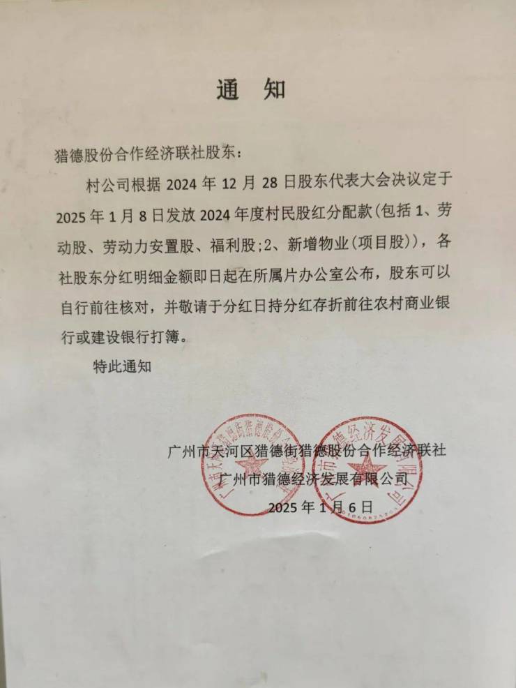 一份关于广州猎德村村民分红的通知