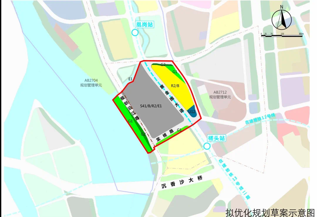 落实产业及居住配套用地,黄金围大道东侧地块用地性质调整为二类居住用地兼容商业服务业设施用地(R2/B),建筑面积约 23.1万平方米;黄金围大道西侧地块用地性质调整为公共交通场站用地兼容商业服务业设施用地、二类居住用地及水域(S41/B/R2/E1),建筑面积约 35.7 万平方米。